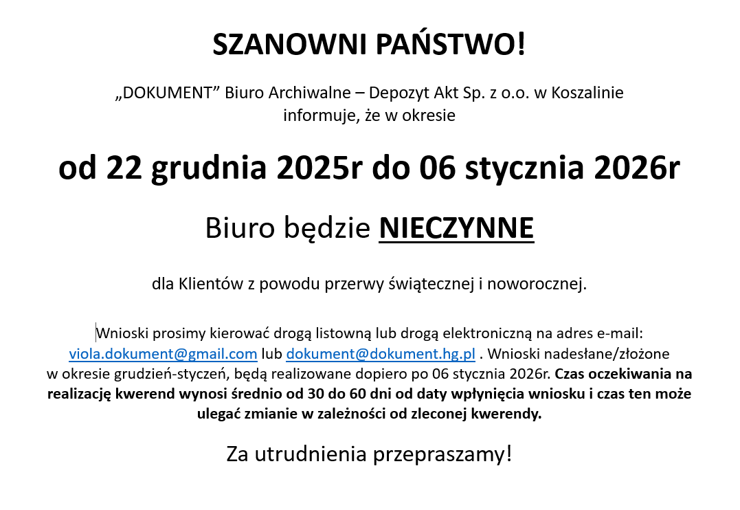 Archiwizowanie dokumentacji – Dokument Biuro Archiwalne – Depozyt Akt w Koszalinie